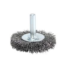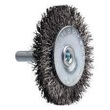 Escova circular de aço carbono temperado, tipo com haste, com tufos de filamentos ondulados, fio de 0,5 mm de espessura, haste com encaixe de 1/4 (Aprox. 6 mm), altura 8, 10 e 12 mm, rotação máxima de 4.500 R.P.M, para remoção de ferrugem, solda, rebarba, tinta, etc.