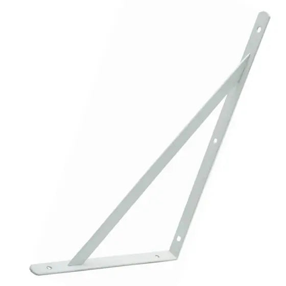 Mão Francesa (Suporte de prateleira) de 16x25cm, com qualidade Flex, super econômica, em aço forjado e temperado, em L 90 graus, barra central com 1,5cm de largura e espessura de 1/8 (aprox. 3mm), possui orifícios com recesso para embutir a cabeça dos parafusos, soldas por arco elétrico continuo, de grande resistência, pintura eletrostática branca. Própria para suporte de prateleiras de madeira, alumínio, de média resistência.