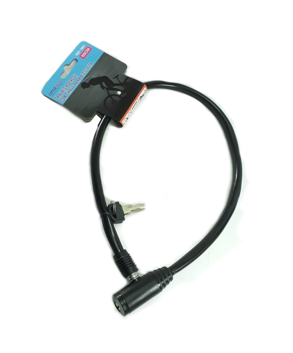 Trava para bicicleta com chave, comprimento 65 cm, diâmetro externo 5,5 mm, cobertura em PVC, interior em cabo de aço, trançado com 7 fios de 0,6 cada, pontas em borracha termoplástica